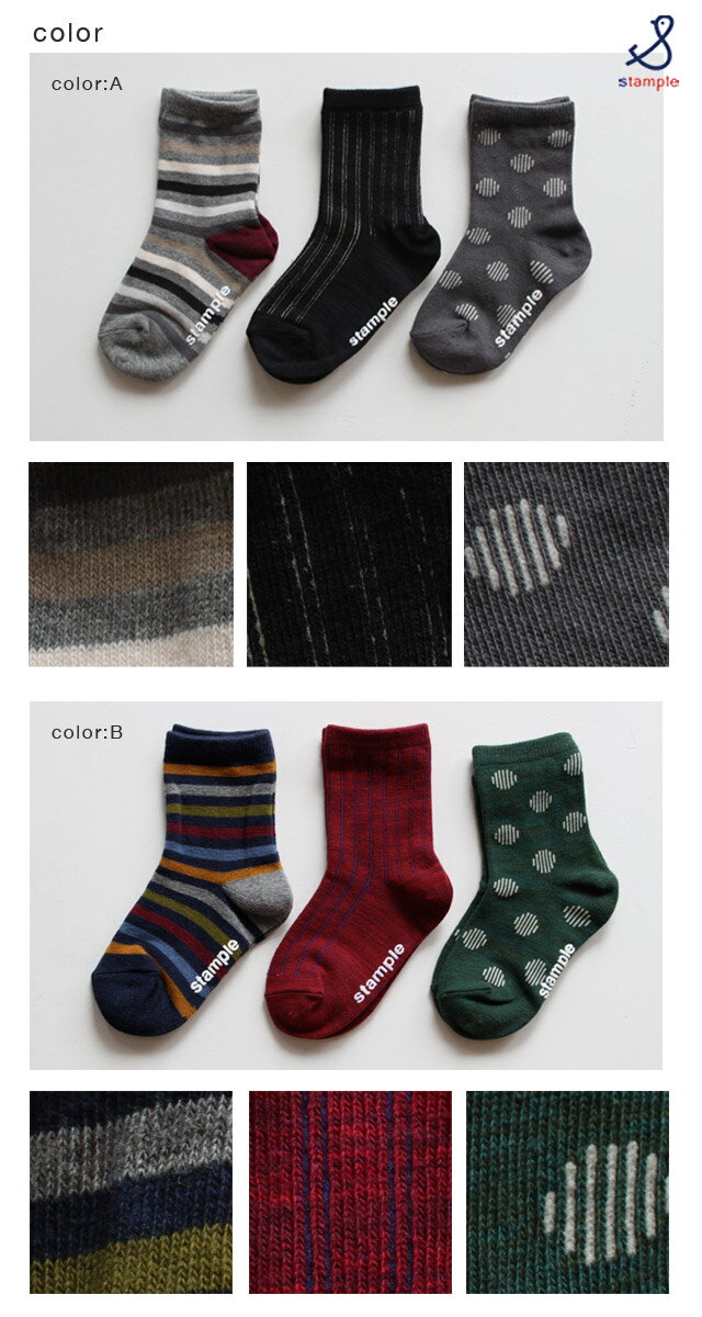 【クーポン最大1000円OFF】【ネコポス送料無料!】靴下/くつ下/履きやすい/シンプル/保育園/幼稚園/3枚組/男の子/女の子/おしゃれstample【スタンプル】3パターンクルーソックス3P 【1セット(3足組)】【キッズ・ジュニア】S〜LLサイズ