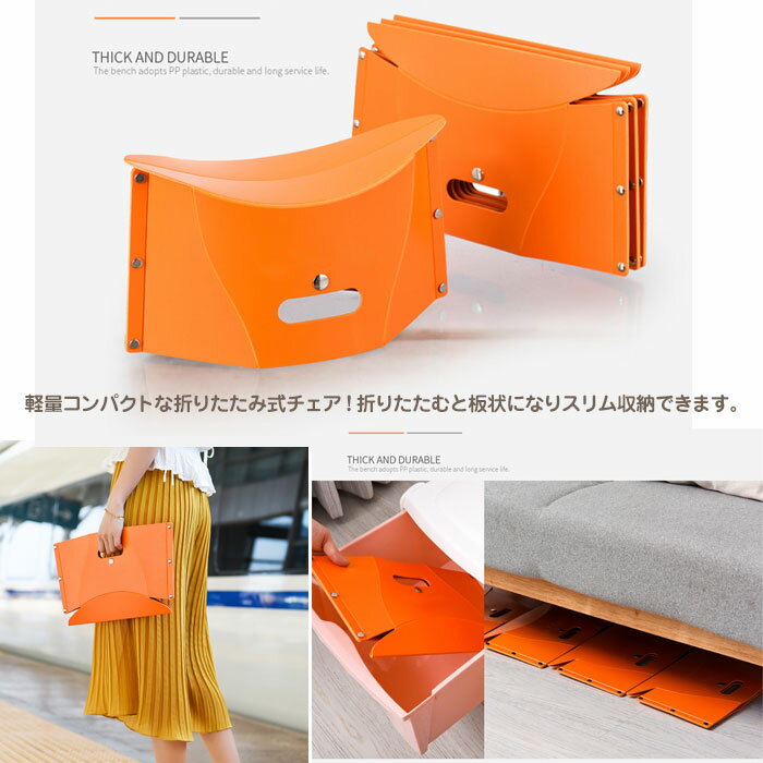 ◇ 折りたたみ ポータブルチェア 仕様 ◇ ◆ 組み立て時サイズ:約横幅32cm×奥行13.5cm、高さ(中央部)15cm(両端)18.5cm ◆ 折りたたみ時サイズ:約縦幅21.5×横幅37×厚み1cm ◆ 耐荷重:約60kg ◆ 重 量:約250g ◆ カラー:グリーン、ブラック、オレンジ ※ 説明書等は付属しておりません。