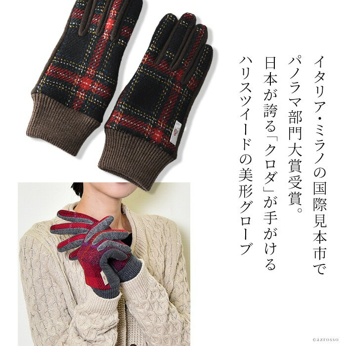 ブランド名 kuroda(クロダ) バリエーション ・ホワイト千鳥 ・ネイビーウォッチブラウン ・フクシアグレー ・ブラック×ネイビーウォッチ ・ネイビーヘリンボーン 素材 ・甲:ハリスツイード(毛100%) ・手のひら側:通電ジャージ(毛・アクリル) ・裏地:モイスチャージャージ(保湿成分スクワラン配合+抗菌消臭機能)アクリル60%・レーヨン40% ・カフス部:アクリル100% サイズ 手囲い:21cm 全長:23cm 中指の長さ(外寸):約9cm ※縫い方によって若干の誤差がございます。